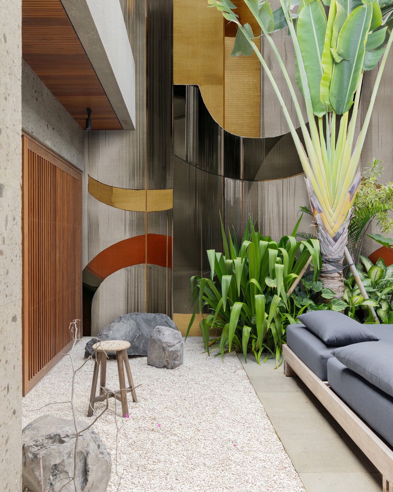 Made-to-measure outdoor wall covering resistant to rain, yellowing and with anti-smog properties.